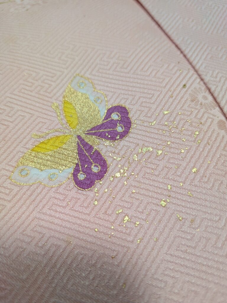 磐田市にある着物仕立て販売・振袖コーデ・着物クリーニングお直し・着付け・着付け教室 kimonoはじめ花くらの花蔵です。この度、七五三着物の黄変しみ抜きのご依頼を頂きました。細かく広範囲に広がる黄変ジミを丁寧にしみ抜き処理した上で、取りきれない部分や生地に負担をかけないよう金彩加工を施した例です。金彩加工は、元の柄より華やかさが増し、より一層豪華な趣きになるのが特徴です。化繊には手を付けられませんが、正絹(絹100%)であればシミ抜き金彩加工が可能です。見積り無料ですので、諦める前に一度ご相談ください。見積り金額がご予算に合わなければ見送ることも可能です。生まれ変わる着物のすばらしさをどうぞご実感ください。
